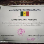 Remerciements à Monsieur Allegro Xavier pour son engagement au village de Bilasse, Casamance pour la construction d’un puits communautaire favorisant le retour des populations après de graves événements en 1992, des hommes armés avaient pillé et incendié le village, forçant les habitants à l'exode.